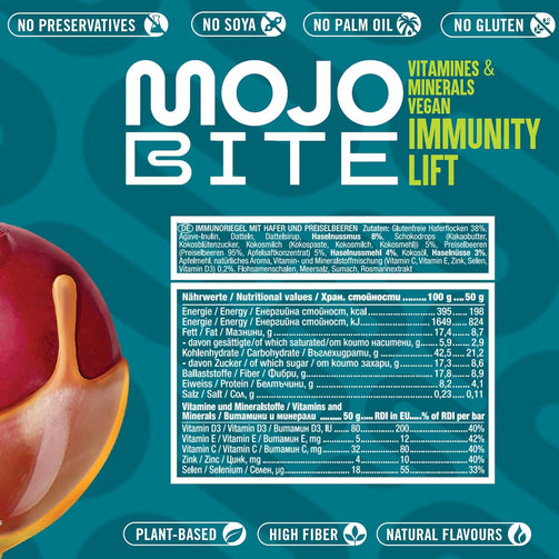 MojoBite Immunity Lift Berry Hazelnut Oat Bar - 12 x 50g – Weicher Haferriegel mit Preiselbeeren und Haselnüssen - 40% Vitamine D3, C, E, Zink, Selen - Faserreich, Vegan, Glutenfrei